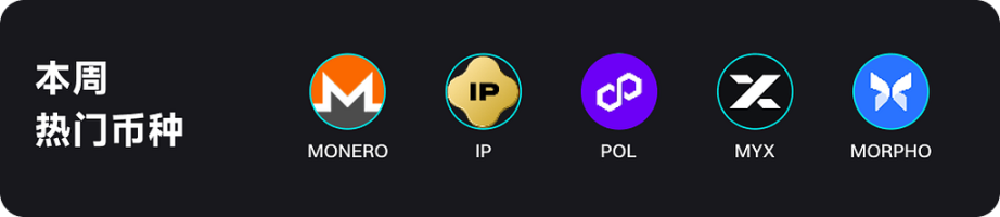 热门币种方面,MONERO、IP、POL、MYX 和 MORPHO 都有着不俗的表现,涨幅百分比位列前五。 MONERO 本周价格上涨 29.41%。IP 价格上涨 29.35%。POL 价格上涨 26.67%。MYX 和 BONK 本周分别上涨 11.55% 和 10.61%。